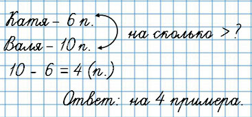 4. Катя составила 6 примеров с ответом 8, а Валя — 10 таких примеров. На сколько больше примеров составила Валя, чем Катя?