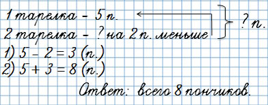 4. На одной тарелке 5 пончиков, а на другой — на 2 пончика меньше. Сколько всего пончиков на этих двух тарелках?