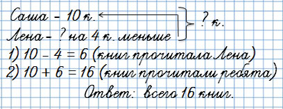 5. За лето Саша прочитал 10 книг, а Лена — на 4 книги меньше. Поставь вопрос и реши задачу.
