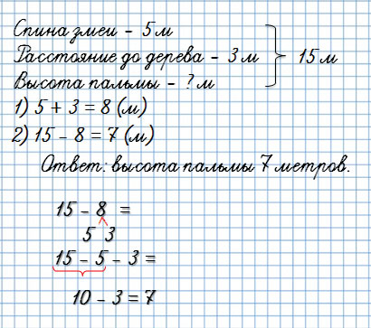 Оставаясь на той же высоте, обезьянка перепрыгнула на соседнее дерево, которое стояло в 3 м от пальмы. Какой высоты была пальма, если обезьянка проделала путь в 15 м?