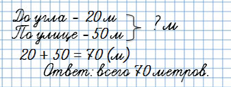6. Митя решил измерить дорогу от дома до школы. От дома до угла переулка, в котором он жил, получилось 20 м, а по улице - ещё 50 м. Сколько всего метров проходит Митя от дома до школы?