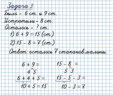 Дополняю данные: а бабушка - 9 стаканов. На варенье бабушка взяла 8 стаканов малины. Сколько стаканов малины осталось?