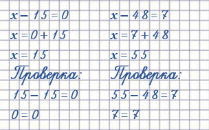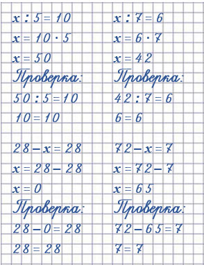 | х : 5 = 10 х = 10 • 5 х = 50 | 28 - х = 28 х = 28 - 28 х = 0 | х - 15 = 0 х = 0 + 15 х = 15 |