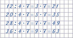 3. Каждое из чисел 12, 20, 28, 36 уменьши в 4 раза, а результат увеличь в 7 раз.