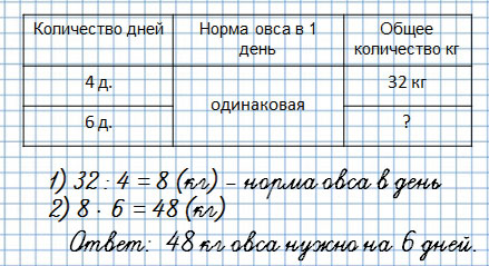 4. На 4 дня лошади нужно 32 кг овса. (Ежедневная норма выдачи овса одна и та же.) Сколько килограммов овса нужно лошади на 6 дней, если норма выдачи в день не изменится?
