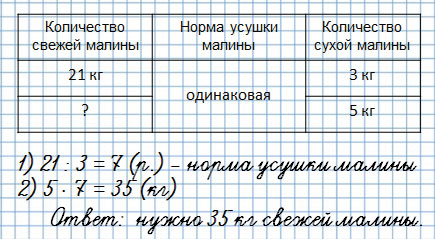 5. Из 21 кг свежей малины получается 3 кг сухой. Сколько взяли свежей малины, если получили 5 кг сухой?