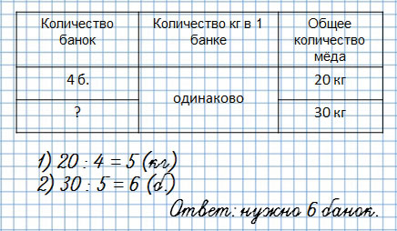 6. В 4 одинаковые банки разлили 20 кг мёда. Сколько потребуется таких банок, чтобы разлить 30 кг мёда?