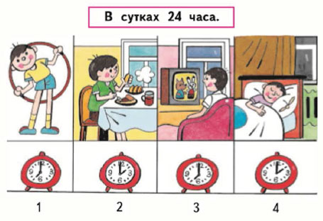 2. 1) Какое время суток изображено на каждом рисунке? Какое время показывают часы на рисунках 1 и 3? 2 и 4?