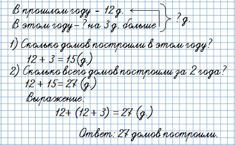 2. В прошлом году в нашем районе построили 12 новых домов, а в этом году — на 3 дома больше. Сколько всего ... ?