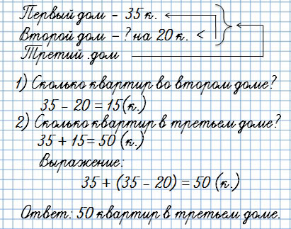 3. В первом из новых домов 35 квартир, во втором на 20 квартир меньше, а в третьем столько, сколько в первом и втором вместе.