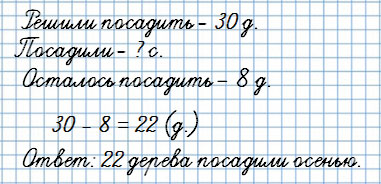 3. Около школы решили посадить 30 деревьев. После осенних посадок осталось посадить ещё 8 деревьев. Сколько деревьев посадили осенью?