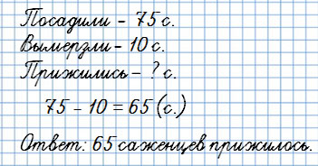 4. Из посаженных в парке 75 саженцев зимой вымерзли 10. Сколько саженцев прижилось?