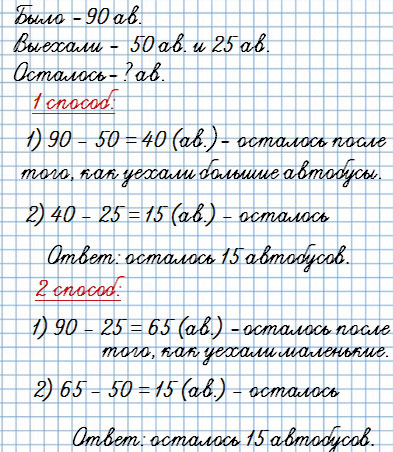 2. В автобусном парке было 90 автобусов. Утром выехало в рейсы 50 больших автобусов и 25 маленьких. Сколько автобусов осталось в парке?