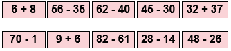 | 82 - 54 | 45 + 29 | 90 - 44 | 18 + 18 |