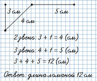 29. Начерти ломаную из трёх звеньев так, чтобы длина первого звена была равна 3 см, а каждое следующее звено было на 1 см длиннее предыдущего. Найди длину этой ломаной.