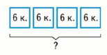 | 1) 6 + 6 + 6 + 6 = 24 (к.) Ответ: 24 к. | 2) 6 • 4 = 24 (к.) Ответ: 24 к. |