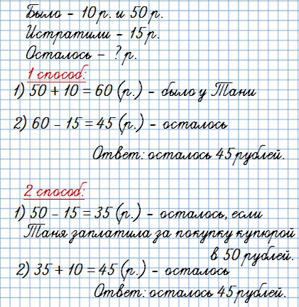 3. Таня сделала покупку на 15 р. У неё было 10 р. и 50 р. Сколько рублей у неё осталось?