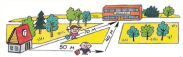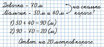 Используя рисунок, скажи, чей путь до короче и на сколько метров.