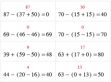 | 87 - (37 + 50) = 87 - 87 = 0 | 70 - (15 + 15) = 70 - 30 = 40 |