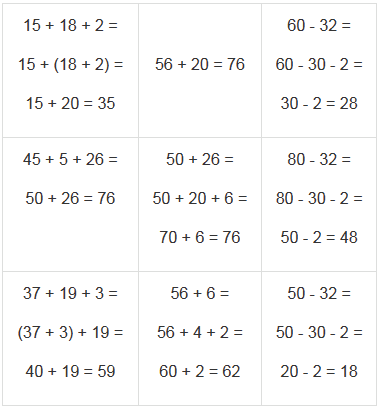 | 15 + 18 + 2 | 56 + 20 | 60 - 32 |