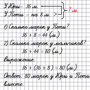 У Юры в коллекции 36 марок, а у Пети на 8 арок больше. Сколько марок у Юры и Пети вместе?