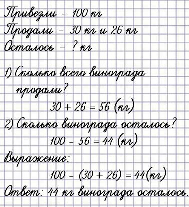 6. В киоск привезли 100 кг винограда. До обеда продали 30 кг винограда, а после обеда еще 26 кг. Сколько килограммов винограда осталось?