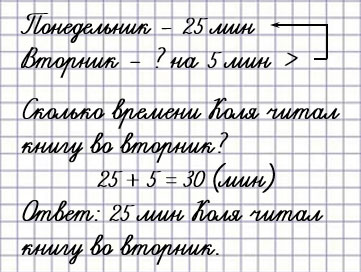 2. В понедельник Коля читал книгу 25 мин, а во вторник — на 5 мин дольше.