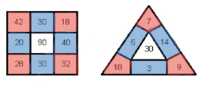 Во второй рамке: сумма чисел вдоль каждой стороны треугольника равна 30.