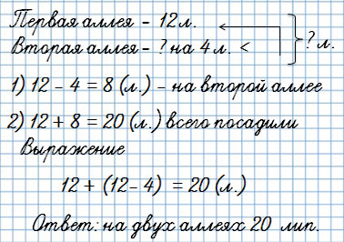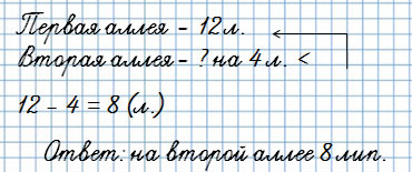 2. На одной аллее 12 лип, а на другой на 4 липы меньше. Поставь разные вопросы задачи.