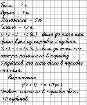 В коробке было несколько кубиков. После того как брат взял из коробки 3 кубика, а сестра положила в коробку 5 кубиков, в коробке стало 12 кубиков. Сколько кубиков было в коробке сначала?