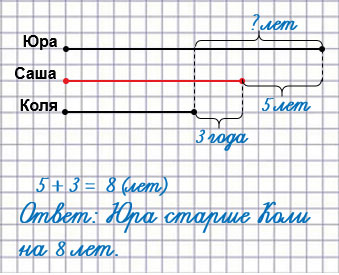 Саша старше Коли на 3 года, но младше Юры на 5 лет. На сколько лет Юра старше Коли?