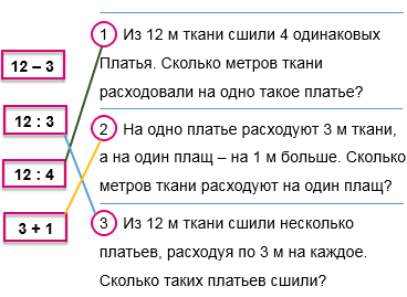 Устно реши задачи. Соедини линией кружок с номером задачи и карточку с выражением для её решения.