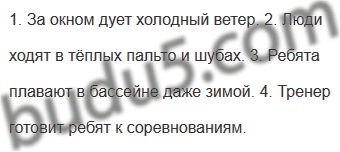 1. За, окно, дуть, ветер, холодный. 2. Люди, ходить, в, тёплые, пальто, и, шубы. 3. В, бассейн, ребята, плавать, даже, зима. 4. Тренер, готовить, ребята, к, соревнования.