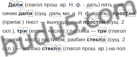 Дали пять книг — синие дали, простой текст — вынужденный простой, три ластика — три ластиком, разбил стекло — молоко стекло на пол.