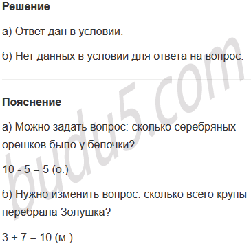 а) У белочки было 10 золотых орешков, а серебряных - на 5 меньше. Сколько золотых орешков было у белочки?