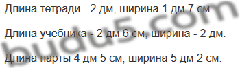 Измерь в дециметрах и сантиметрах: а) длину и ширину своей тетради; б) длину и ширину учебника; в) длину и ширину парты.
