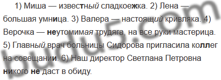 1) Миша — извес(?)ная сладкое(ж, ш)ка. 2) Лена — большая умн..ца. 3) Валера — настоящая кривляка. 4) Верочка — (не)утомимый трудяга, на все руки мастерица. 5) Главная врач больницы Сидорова пригласила ко(л, лл)ег на совещани.. . 6) Наша директор Светлана Петровна (ни)кого (не)даст в обиду.