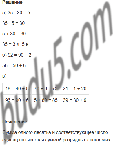 а) Назови разрядные слагаемые числа 35. Запиши в тетради все возможные равенства с числами 5, 30 и 35?