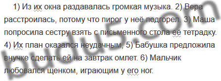 1) Из ихнего окна раздавалась громкая музыка. 2) Вера расстроилась, потому что пирог у неё подгорел. 3) Маша попросила сестру взять с письменного стола свою тетрадку. 4) Ихний план оказался неудачным, 5) Бабушка предложила внучке сделать себе на завтрак омлет. 6) Мальчик любовался щенком, играющим у своих ног.