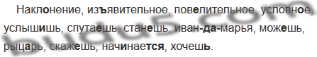 Накл..нение, из(?)явительное, повелительное, услов-н..е, услыш..шь, спута..шь, станешь, иван(да)марья, мож..шь, рыц..рь, скажешь, нач..нает(.)ся, хочеш(.).
