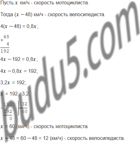 Расстояние между двумя городами мотоциклист проехал за 0,8 ч, а велосипедист - за 4 ч. Скорость велосипедиста на 48 км/ч меньше скорости мотоциклиста. Найдите скорость каждого из них.
