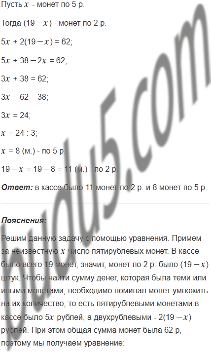 В кассе было 19 монет по 2 р. и по 5 р. на общую сумму 62 р. Сколько монет каждого вида было в кассе?