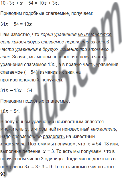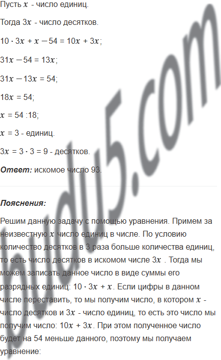 В двузначном числе количество десятков в 3 раза больше количества единиц. Если цифры числа переставить, то полученное число будет на 54 меньше данного. Найдите данное двузначное число.