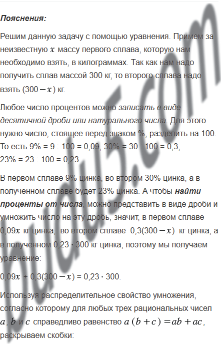 Есть два сплава меди и цинка. Первый сплав содержит 9%, а второй - 30% цинка. Сколько килограммов каждого сплава надо взять, чтобы получить сплав массой 300 кг, содержащий 23% цинка?