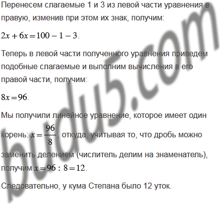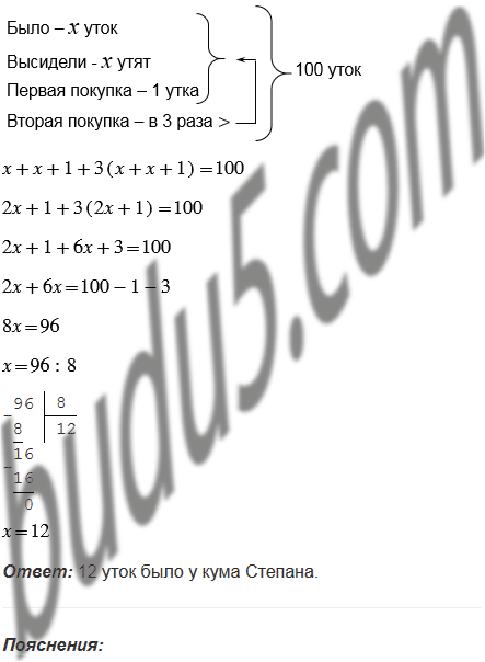 (Задача из русского фольклора). Кум Иван спросил у кума Степана: "Сколько у тебя уток?" Кум Степан ответил: "Уток у меня столько, что как высидят они мне еще столько утят, да еще куплю одну утку, да еще трижды куплю столько, сколько этих уток и утят, то всего будет их у меня 100". Сколько уток было у кума Степана?