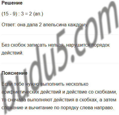 "Мама купила 15 апельсинов. 9 апельсинов она положила в холодильник, а остальные разделила поровну между тремя детьми. Сколько апельсинов она дала каждому?"