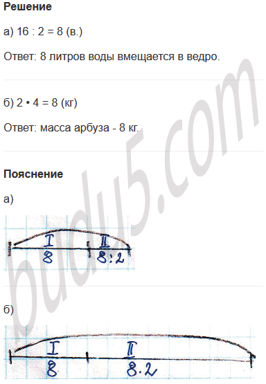 а) В канистру входит 16 литров воды, а в ведро - в 2 раза меньше. Сколько литров воды вмещается в ведро?