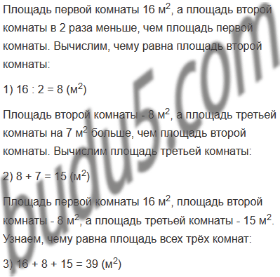 Задание № 7. Площадь первой комнаты 16 м2. Площадь второй комнаты в 2 раза меньше, чем площадь первой комнаты. А площадь третьей комнаты на 7 м2 больше, чем площадь второй комнаты. Чему равна площадь всех трёх комнат?