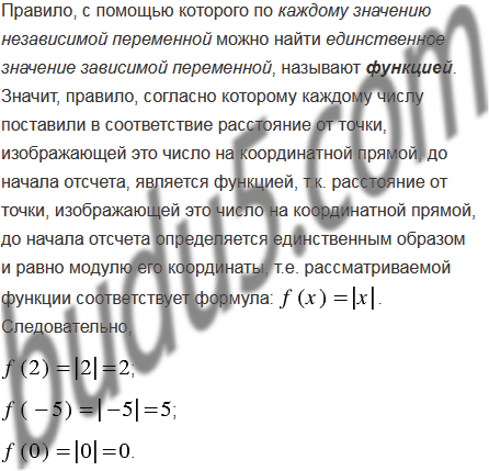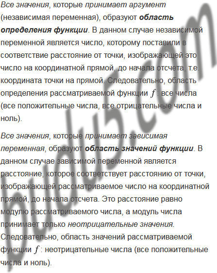 Каждому числу поставили в соответствие расстояние от точки, изображающей это число на координатной прямой, до начала отсчета. Поясните, почему описанное правило является функцией. Найдите ее область определения и область значений. Обозначив эту функцию буквой
