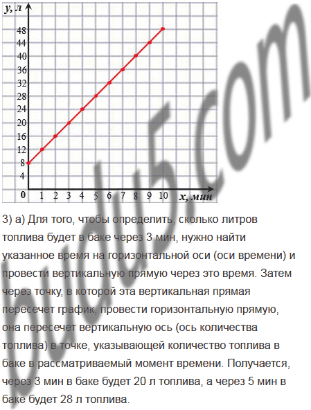 а) сколько литров топлива будет в баке через 3 мин, через 5 мин;